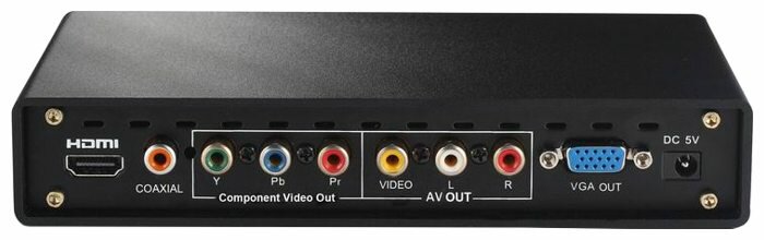 USB 2.0 Type-A x 2, HDMI output, VGA output, coaxial audio output, stereo audio output, composite video output, component video output