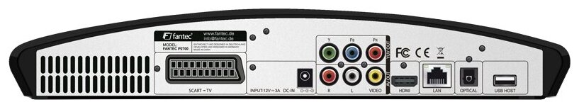 Device type: set-top box, maximum resolution: 1080p, interfaces: Ethernet 10/100, USB 2.0 Type-A x 2, USB 2.0 Type-B, HDMI output, SCART output, optical audio output, stereo audio output, composite video output , component video output, function