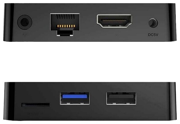 Ethernet 10/100/1000, USB 2.0 Type-A, USB 3.0 Type-A, HDMI output, stereo audio output, composite video output
