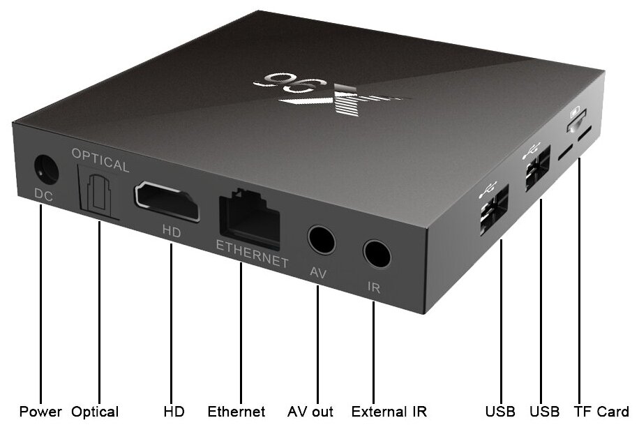 Ethernet 10/100, USB 2.0 Type-A x 2, HDMI output, optical audio output, stereo audio output, composite video output