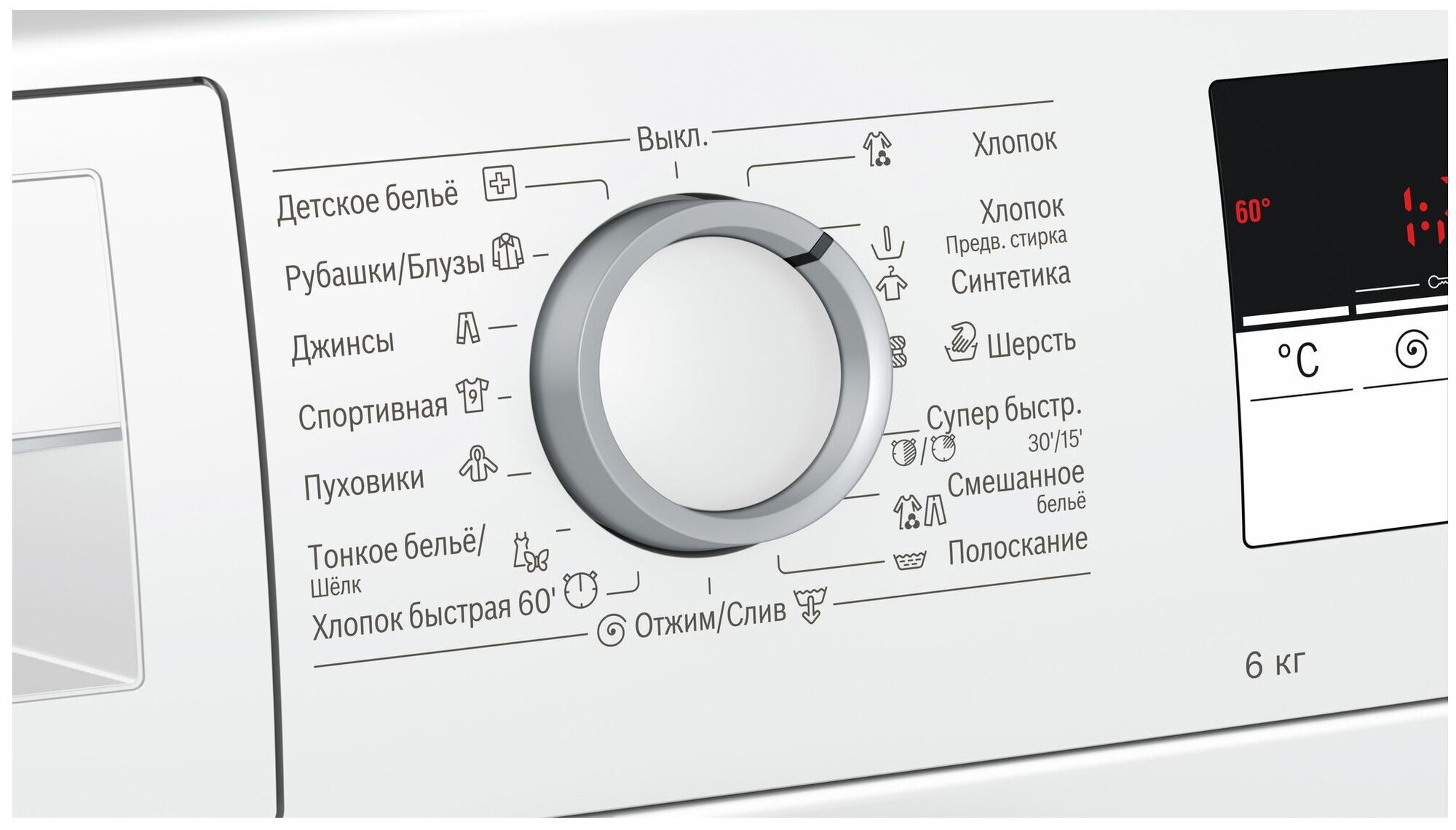 Spin speed selection, washing temperature selection, intelligent washing control, balance control, foam level control, delayed start, direct injection, wash end signal