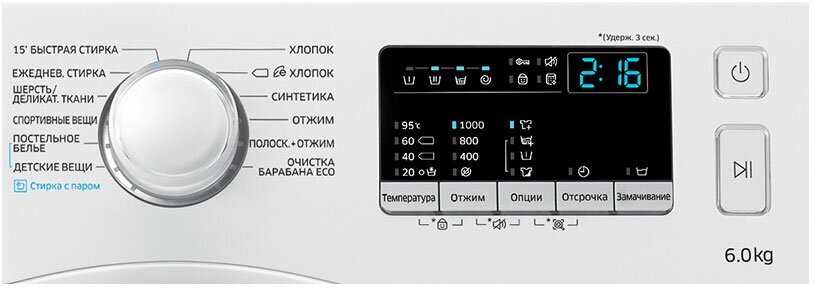 Spin speed selection, washing temperature selection, balance control, foam level control, delayed start, drum cleaning, end of wash signal, automatic cleaning of detergents