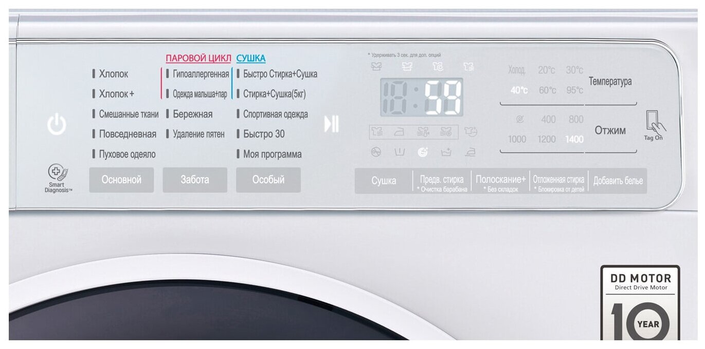 Spin speed selection, washing temperature selection, intelligent washing control, balance control, foam level control, delayed start, wash end signal