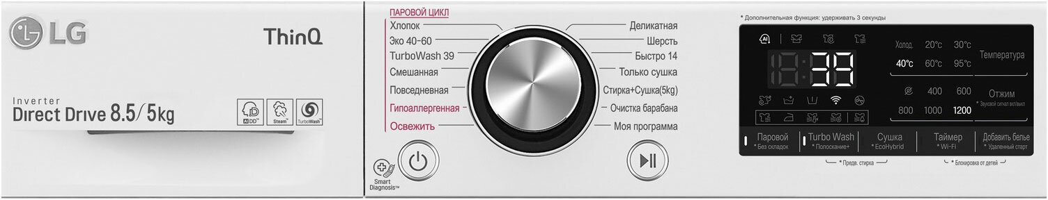 Spin speed selection, washing temperature selection, intelligent washing control, balance control, foam level control, delayed start, wash end signal