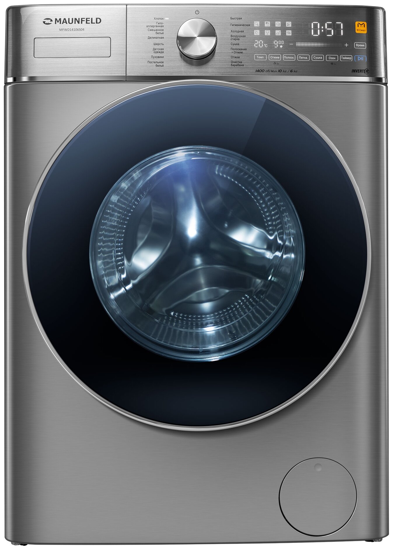 Double-layer hatch door with antimicrobial sealant, interior lighting; hypoallergenic, hygienic, air and cold washing modes, drum cleaning program; drying noise level: 69 dB