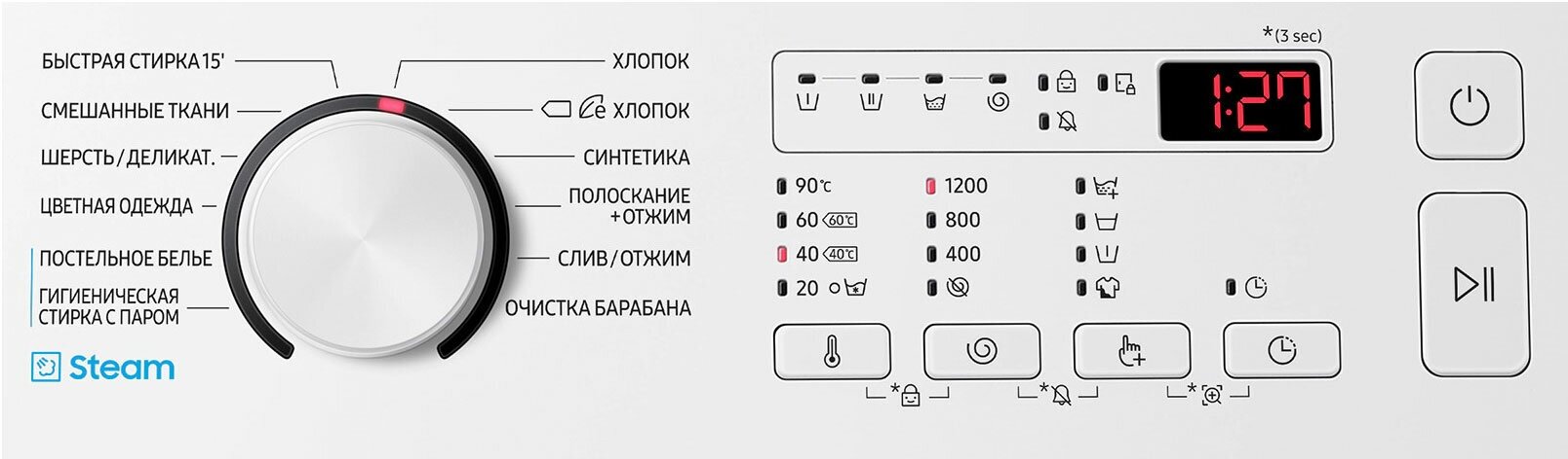 Additional functions: Spin speed selection, washing temperature selection, balance control, beep