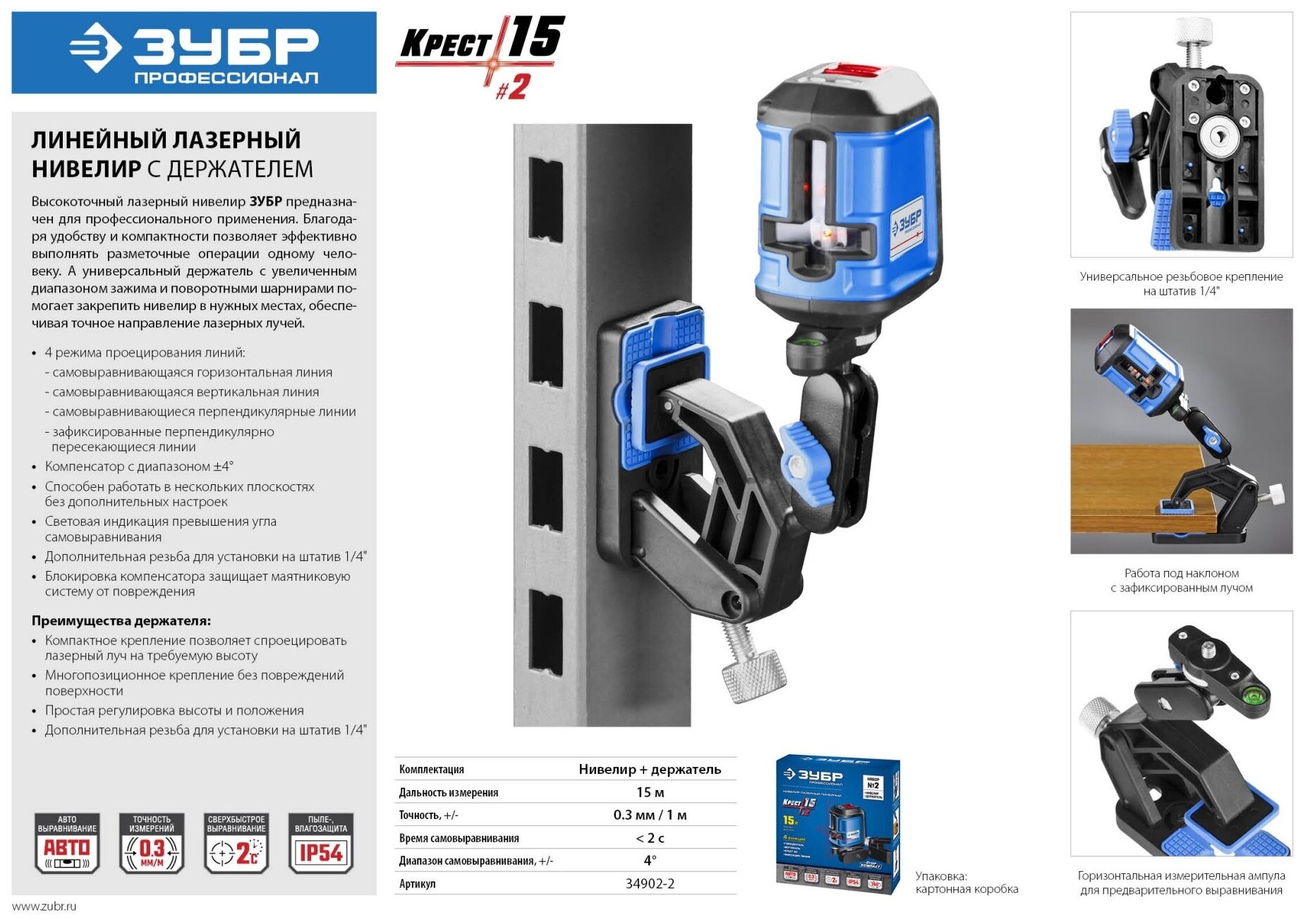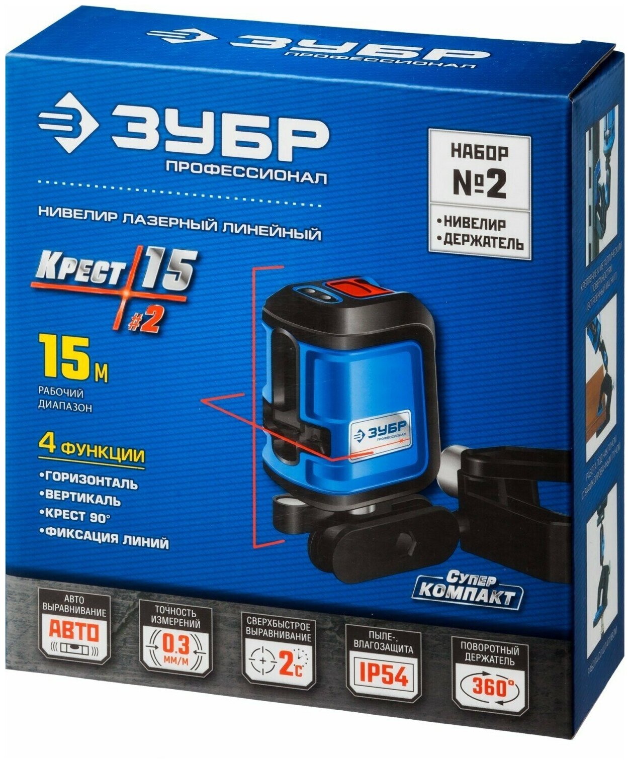 Beam color: red, type: laser, automatic leveling, number of beams: 2 pcs., laser level type: linear, building distance without receiver: 15 m, functions: leveling off, Level building / plane