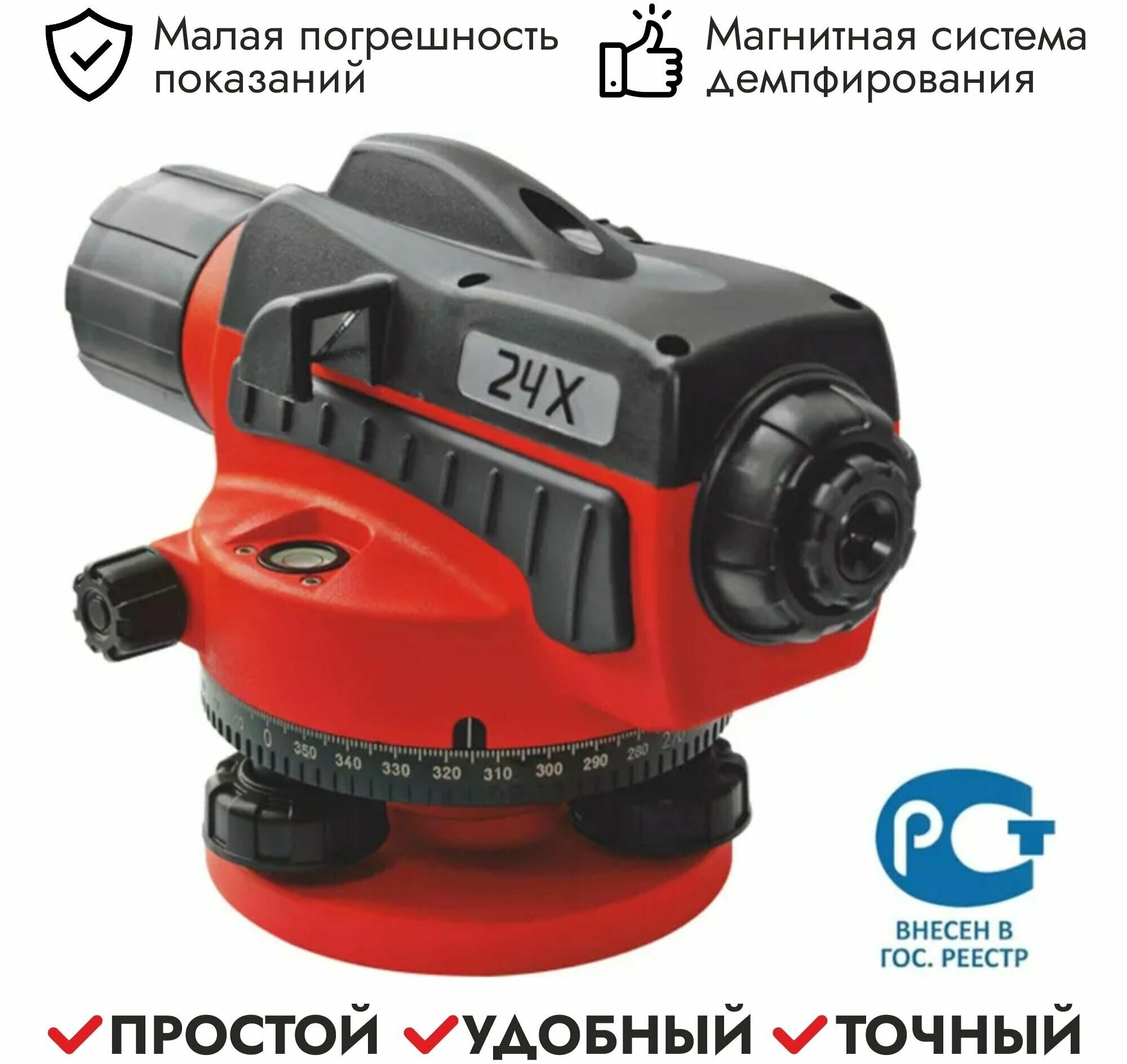 Magnetic compensator with operating range ±15'; the root mean square error per 1 km of double stroke is 2 mm; horizontal limb with a division price of 1 degree and an infinite guidance screw; on top of the spotting scope