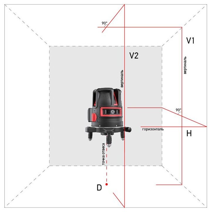 Beam color: red, type: laser, automatic leveling, number of beams: 4 pcs., laser level type: combined, build distance without receiver: 20 m, functions: plumb, level off, turn