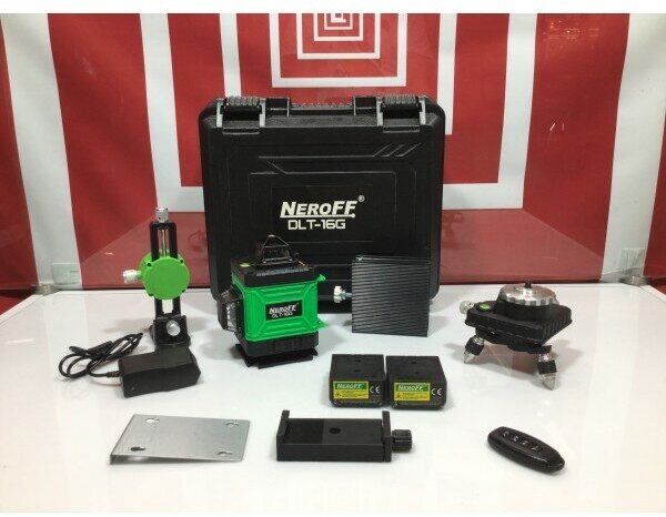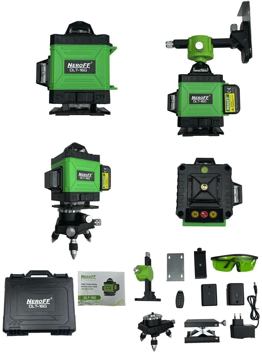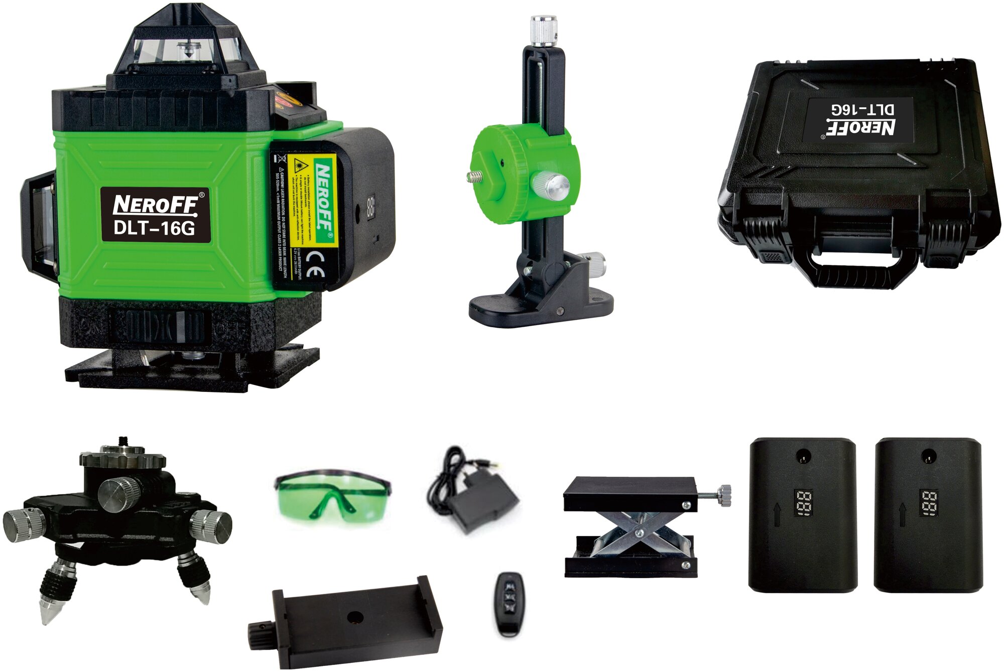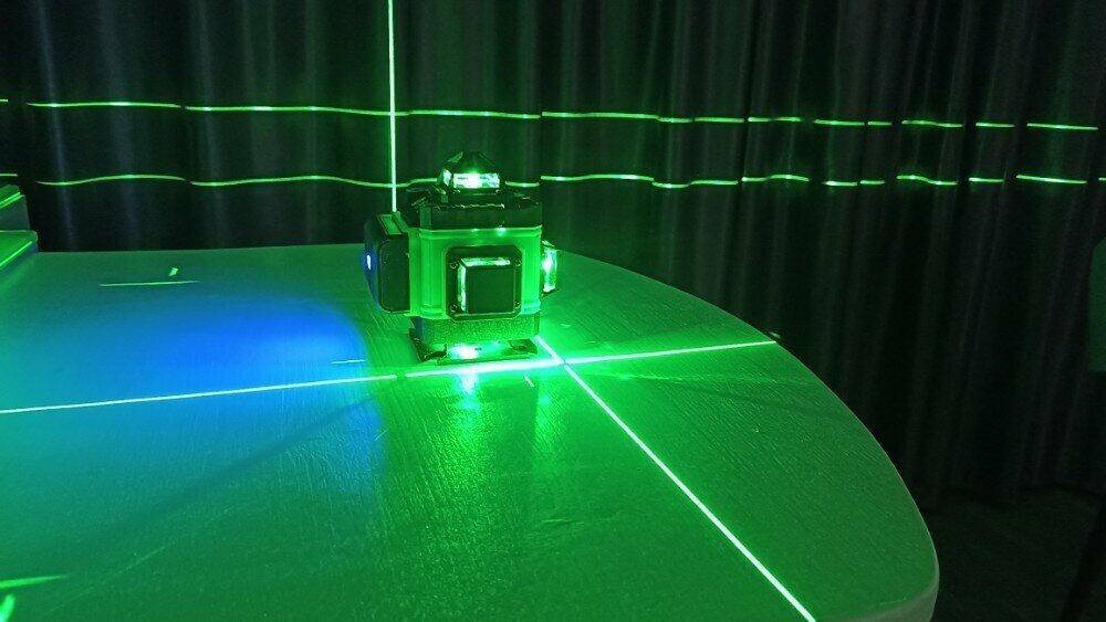 Beam color: green, type: laser, automatic alignment, number of beams: 4 pcs., laser level type: linear, build distance without receiver: 10 m, features: sound indication, equipment: batteries