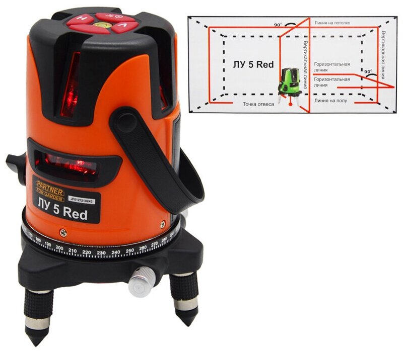 Description: Beam color: red, type: laser, automatic leveling, number of beams: 5 pcs., laser level type: point, build distance without receiver: 10 m, functions: lower horizon, plumb line, leveling off,