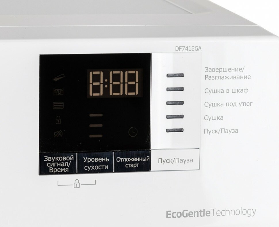 Type: dryer, installation: in a column, freestanding, with heat pump, depth: 508 mm, width: 597 mm, loading type: front, type of drying: condensing with heat pump, modes / functions: gentle drying, children