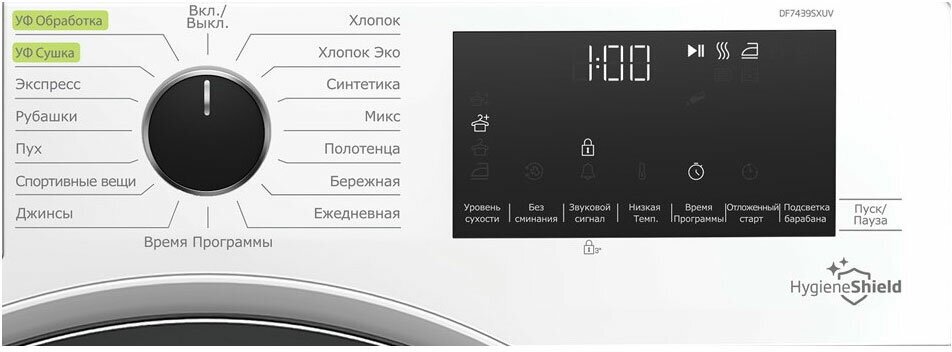 Fluff filter, delayed start, reverse rotation of the drum, condensate collection, end of wash signal, program duration setting