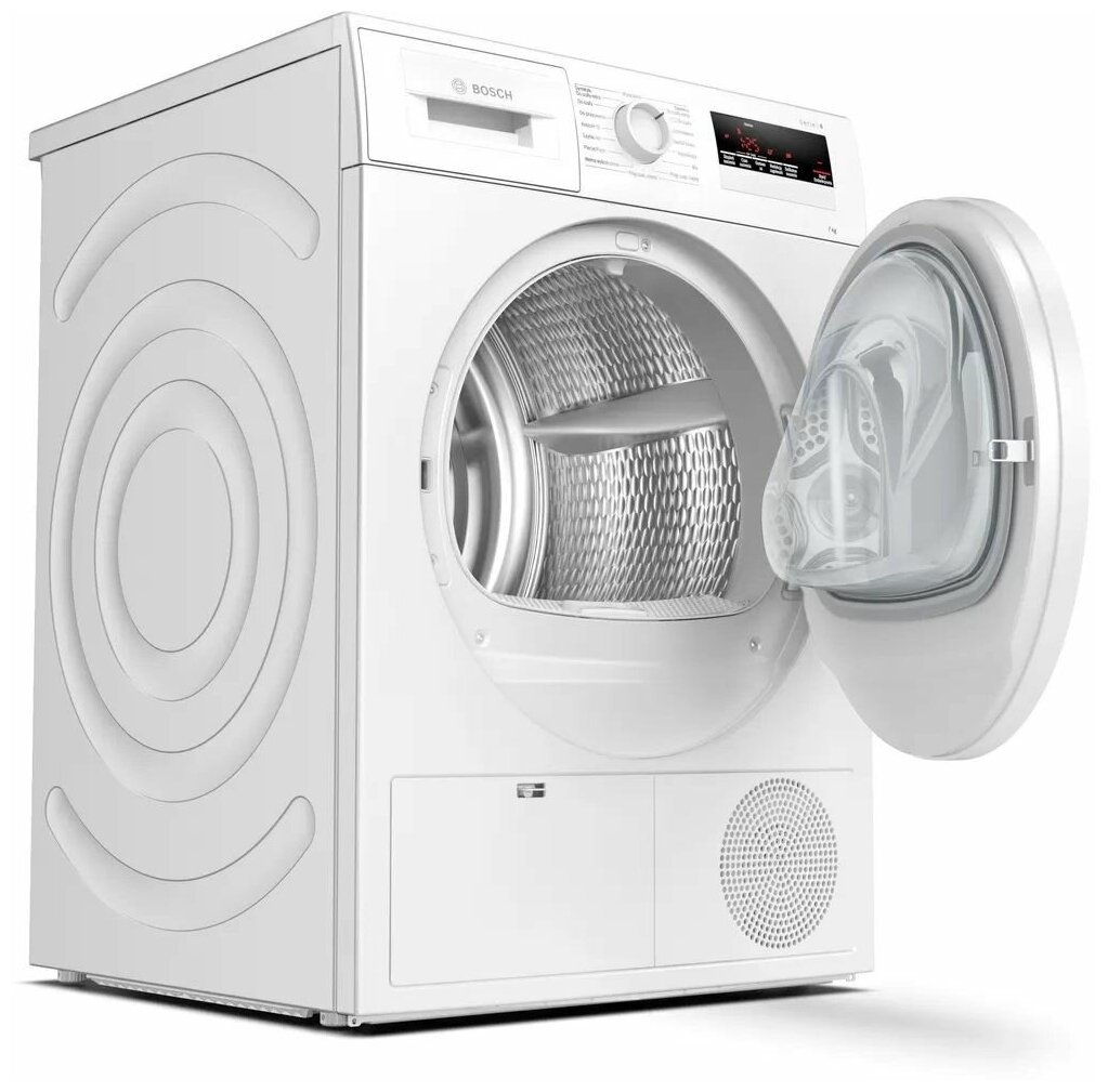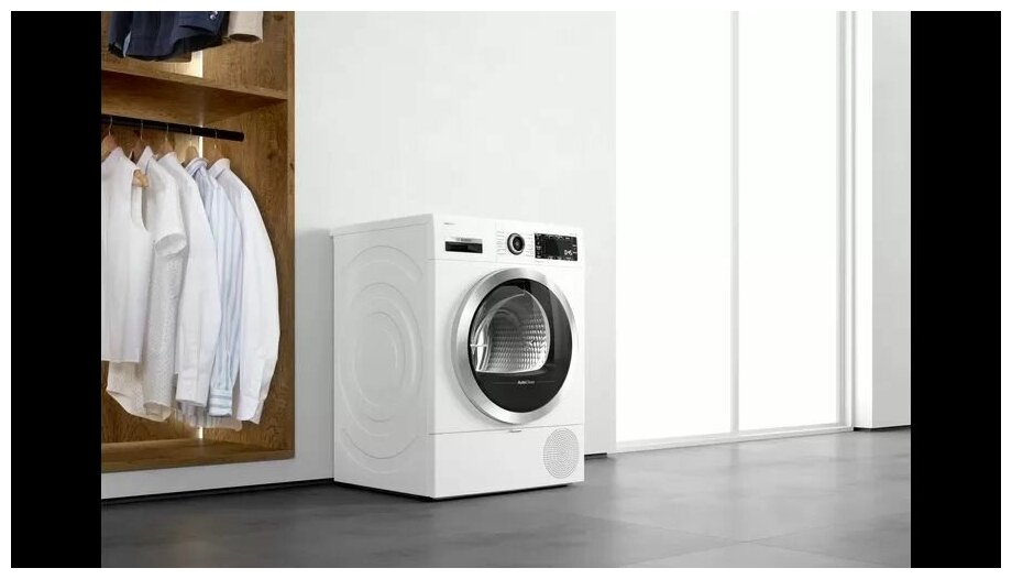 Type: tumble dryer, installation: in a column, freestanding, depth: 609 mm, width: 596 mm, loading type: front, drying type: condensing with heat pump, modes / functions: gentle drying, easy ironing, sound