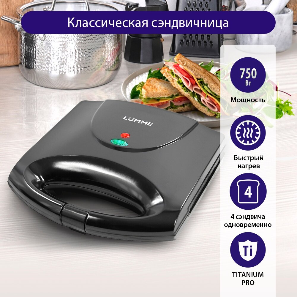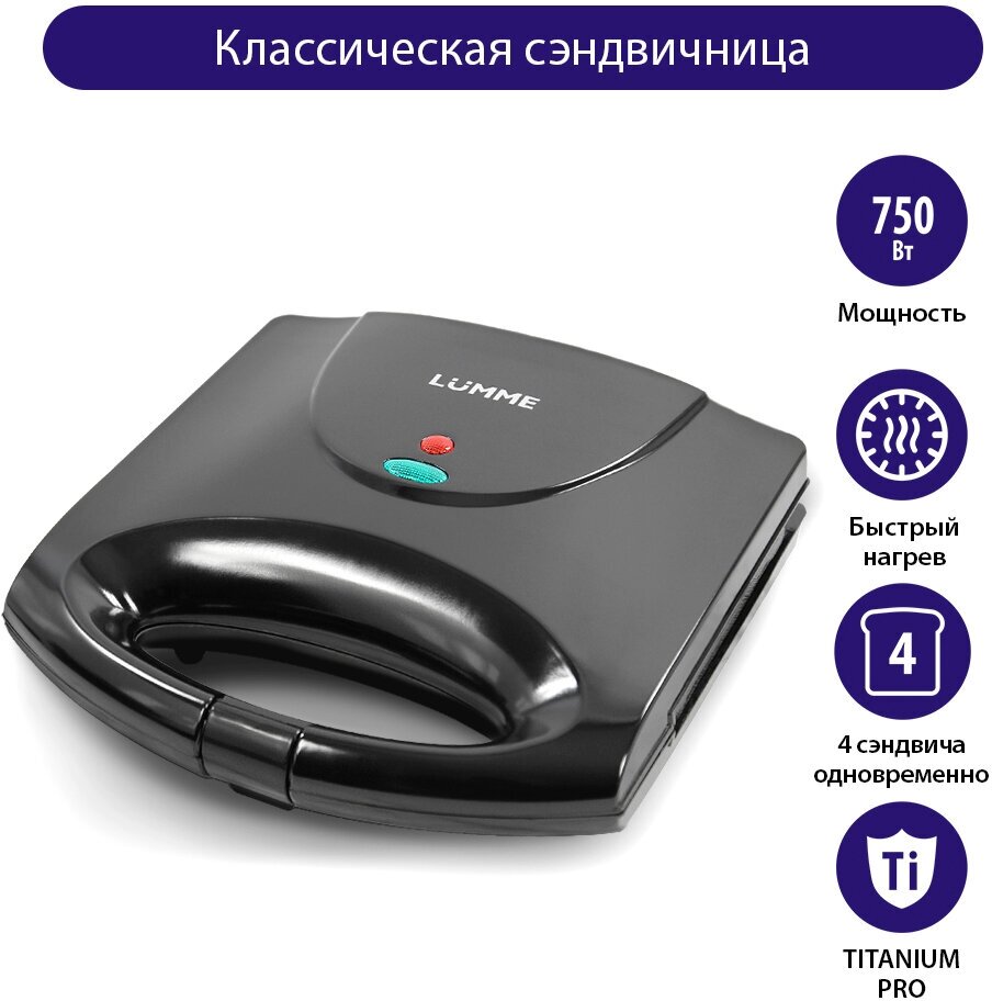Type: sandwich maker, type of panel: sandwiches, power: 750 W, number of servings: 4, features: non-stick coating, overheating protection, operation indicator
