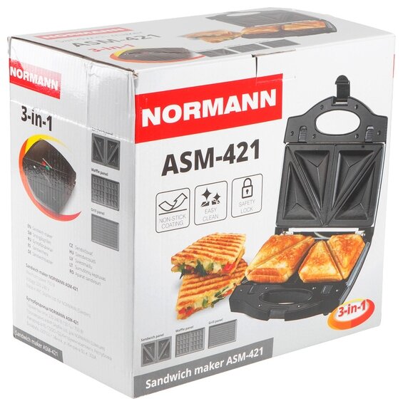 Type: appliance with interchangeable panels, panel type: waffles, grill, sandwiches, waffle panel type: Belgian, power: 750 W, features: non-stick coating, possibility of changing panels, operation indicator