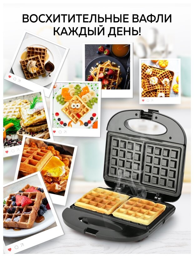 Type: appliance with interchangeable panels, panel type: waffles, grill, sandwiches, waffle panel type: Belgian, power: 790 W, features: non-stick coating, possibility of changing panels, overheating protection, work indicator