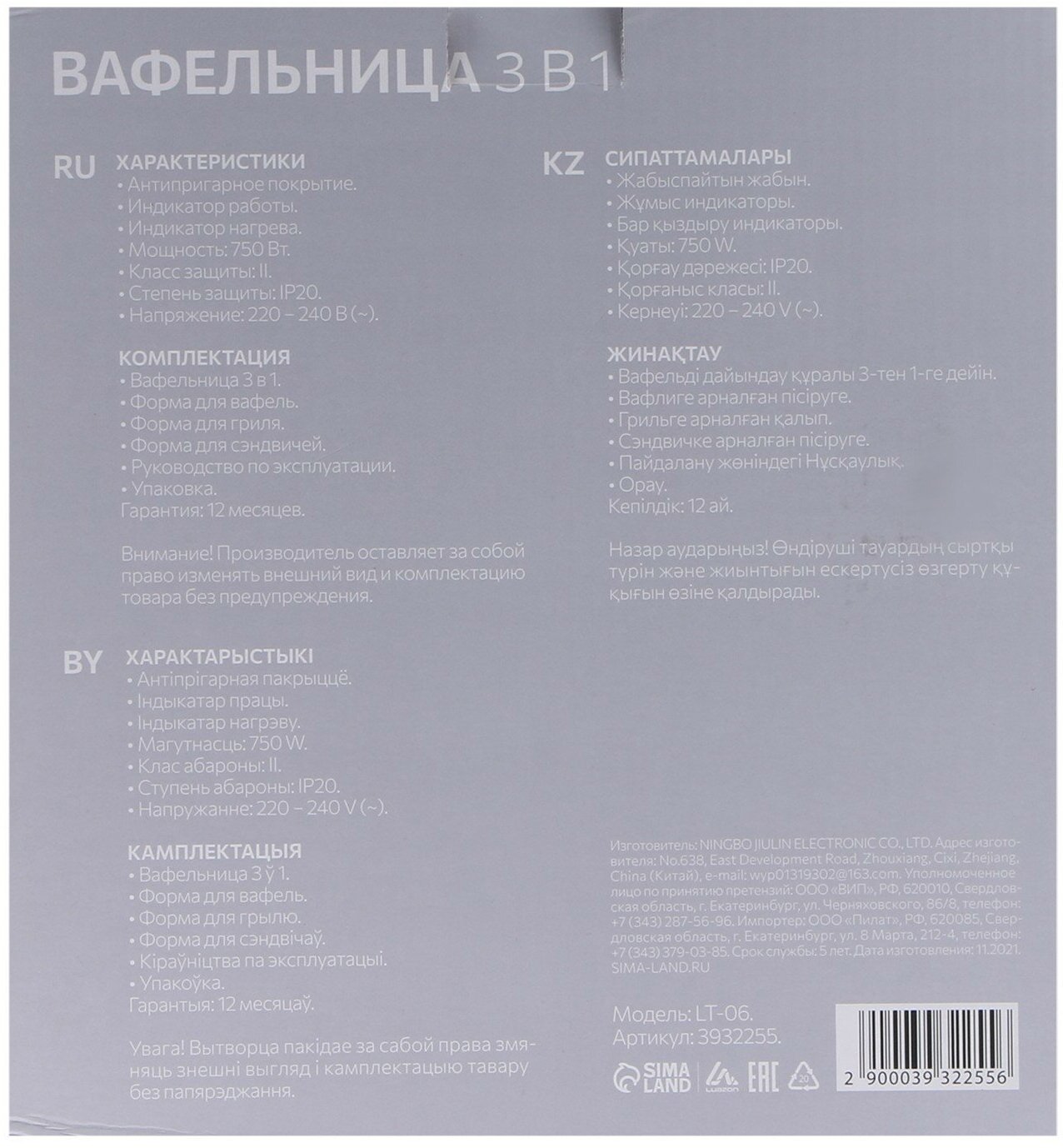 Type: waffle maker, panel type: waffles, grill, waffle panel type: Viennese, power: 750 W, features: non-stick coating, operation indicator, On indicator light, Heating indicator light