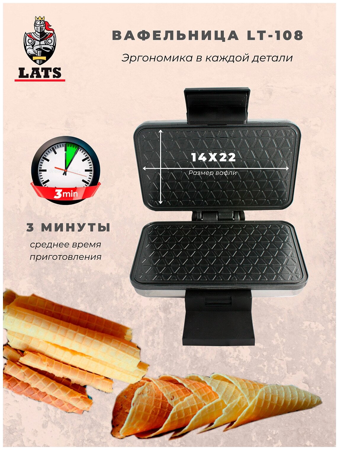 Waffle iron with non-stick coating for thin waffles LATS LT-108