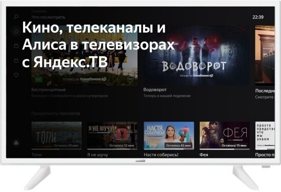 Diagonal: 32"-39", diagonal exactly: 32", HD resolution: 720p HD, screen refresh rate: 50Hz, screen technology: LED, Digital TV support: DVB-C, DVB-S, DVB-S2, DVB- T, DVB-T2, analog PAL, SECAM, NTSC, no, Smart TV platform: Yandex TV, wireless