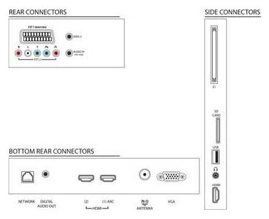 Ethernet - RJ-45, SCART, USB Type-A, HDMI in, HDMI x 3 in, VGA in, digital coaxial audio out, headphone out, component video in, CI slot, SD slot