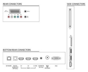 Ethernet - RJ-45, SCART, USB Type-A, USB Type-A x 2, HDMI in, HDMI in x 4, VGA in, digital optical audio out, headphone out, component video in, CI slot, SD slot