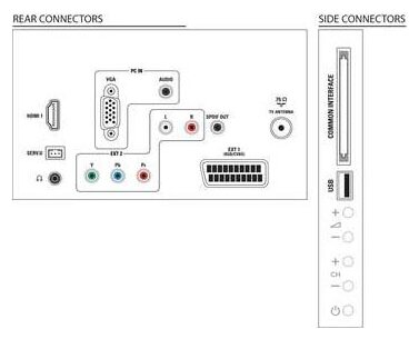 SCART, USB Type-A, HDMI input, VGA input, digital coaxial audio output, headphone output, component video input, CI slot