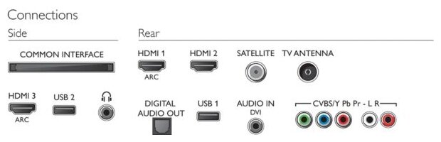 Connectors and interfaces: AV In, USB Type-A x 2, HDMI In, HDMI In x 3, Digital Optical Audio Out, Headphone Out, Composite Video In, Component Video In, CI Slot, CI/CI+ Slot