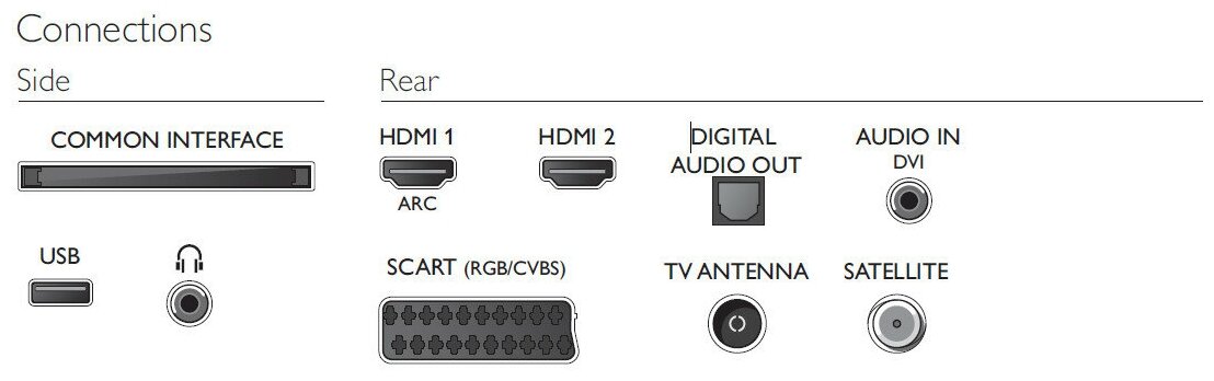 Connectors and interfaces: SCART, USB Type-A, HDMI in, HDMI in x 2, digital optical audio out, headphone out, CI slot, CI/CI+ slot