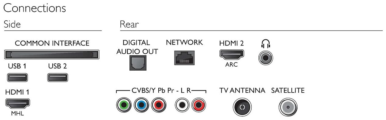 AV-in, Ethernet - RJ-45, USB Type-A x 2, HDMI in x 2, digital optical audio output, headphone output, composite video input, CI/CI+ slot