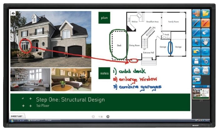 Touch screen; horizontal / vertical arrangement; support for Windows® XP/Vista/7; optional connectors PN-ZB01: DVI input/output, Ethernet interface, RGB, S-Video input, audio input; full white LED backlight