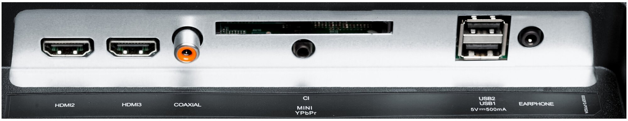 AV in, USB Type-A x 2, HDMI in x 3, digital coaxial audio out, headphone out, composite video in, CI slot