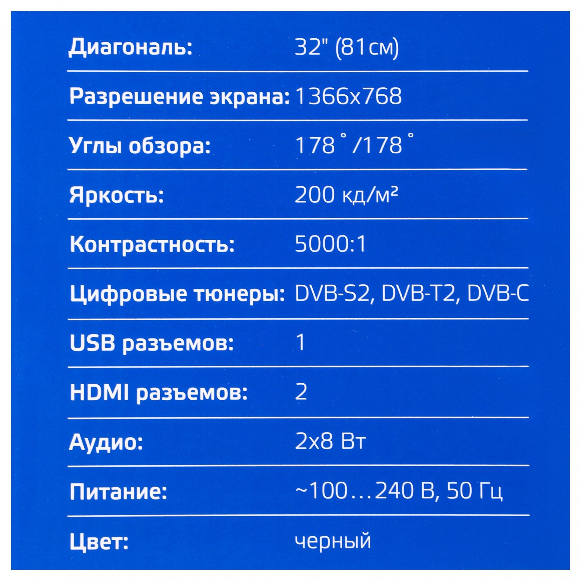 Description: Diagonal: 32-39, diagonal exactly: 32, HD resolution: 720p HD, screen refresh rate: 60Hz, screen technology: LED, Digital TV support: DVB-C, DVB-S, DVB-S2, DVB- T, DVB-T2, Analogue PAL, SECAM, NTSC, No, Smart TV platform: Android TV, wireless with
