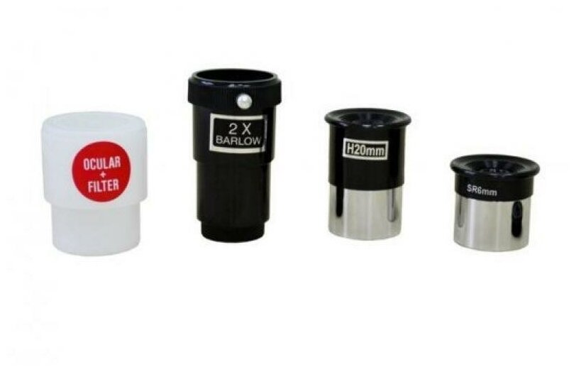Eyepieces 6 mm and 20 mm; Barlow lens 2x; compass; moon filter