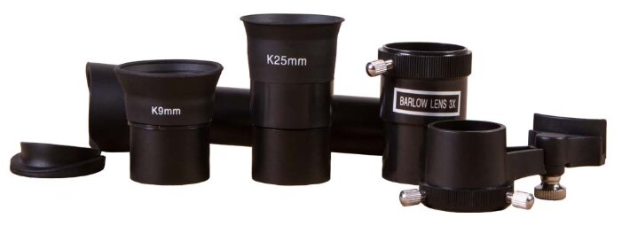 Telescope, eyepieces K9 mm 44x, K25 mm 16x; Barlow lens 3x; diagonal mirror; optical finder 5x20; tripod; carrying bag