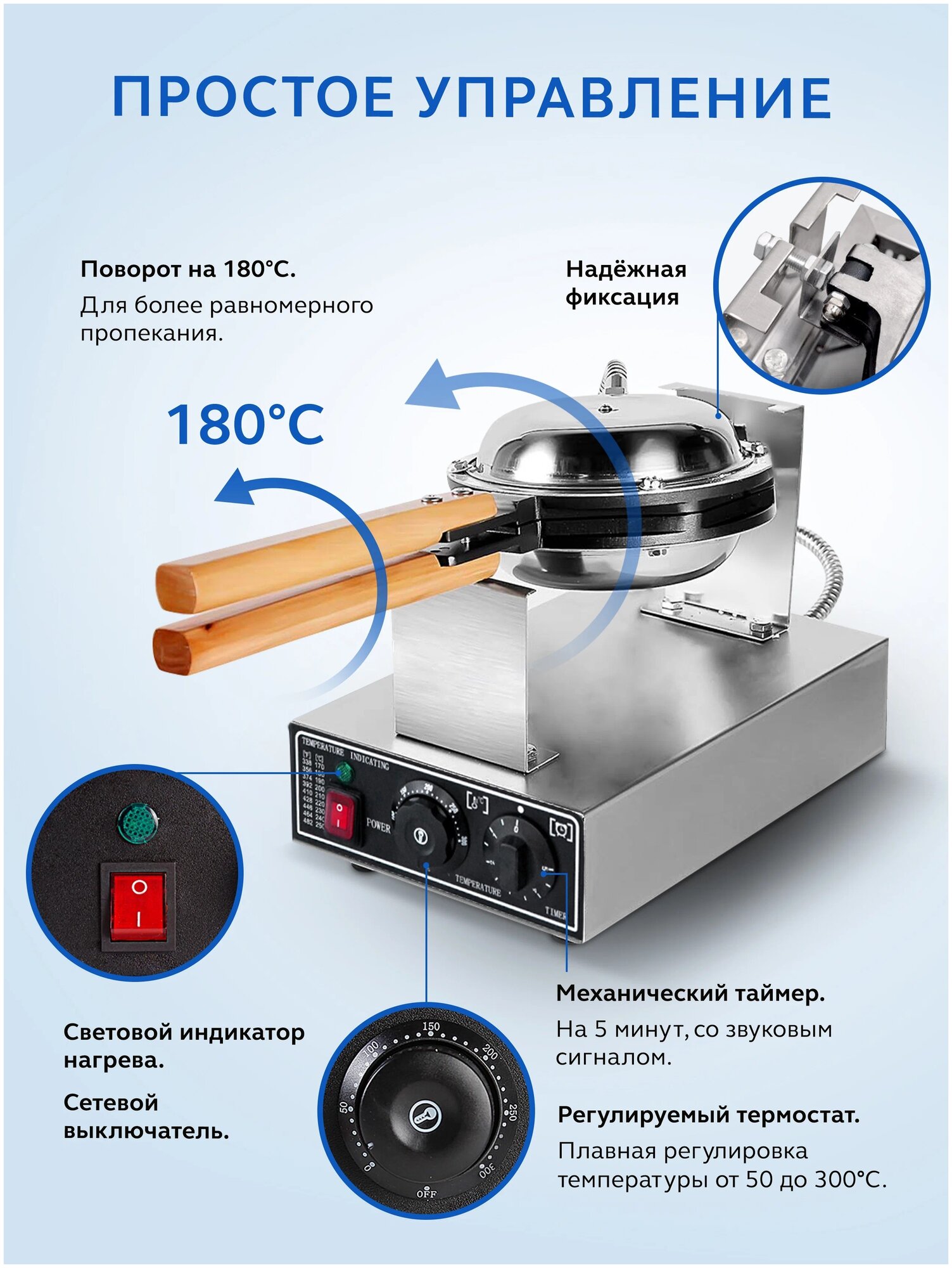 Type: waffle iron, number of containers: 1, container material: cast iron, maximum operating temperature: 250 °C, control: mechanical, power consumption: 1.40 kW, installation: tabletop