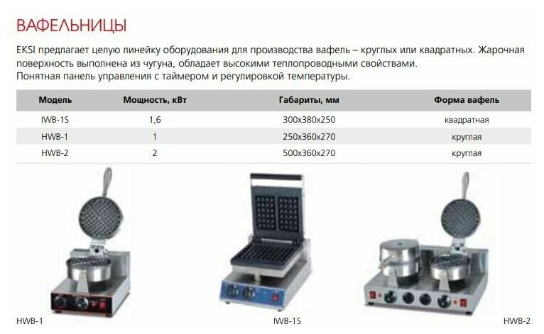 Type: waffle maker, number of containers: 2, container material: cast iron, control: mechanical, power consumption: 2 kW, installation: tabletop