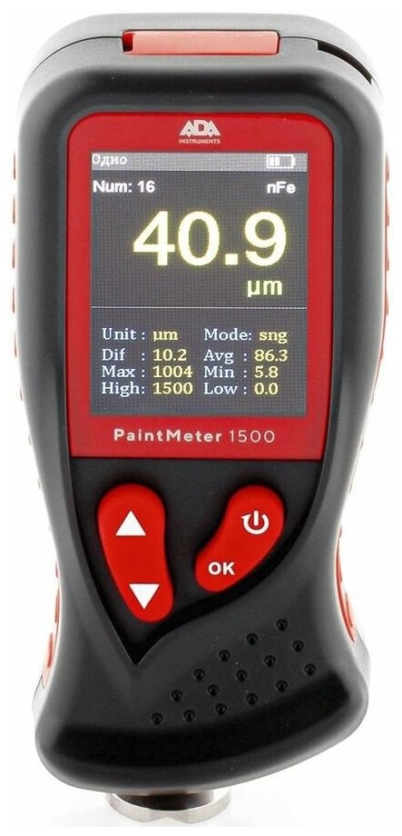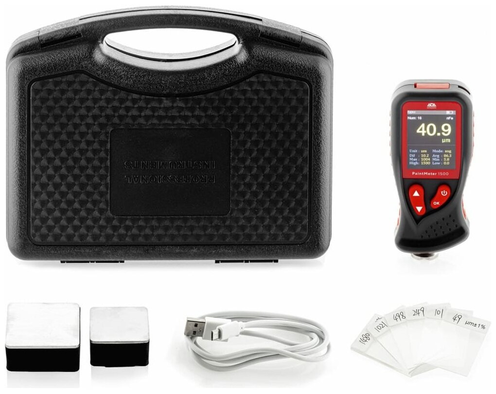 Measuring principle: eddy current, maximum thickness: 1350 µm, maximum error: 3%, acoustic signal, auto-off, battery: batteries, number of batteries: 2, measuring surfaces: non-ferrous metals, �
