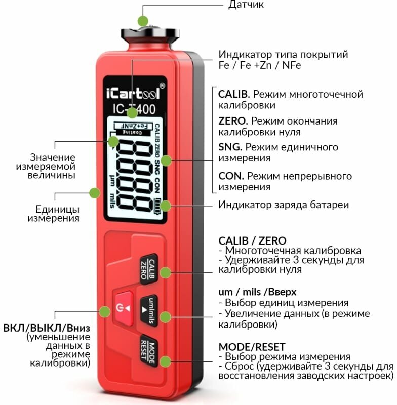 Measuring principle: eddy current, maximum thickness: 1350 µm, maximum error: 3%, acoustic signal, auto-off, battery: batteries, number of batteries: 2, measuring surfaces: non-ferrous metals, �