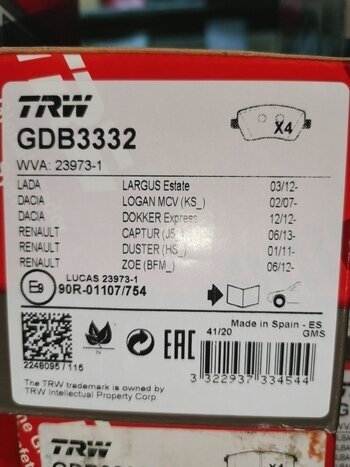 Type: disc brake pads, car make: LADA VAZ, car model: BMW 3 series, LADA Largus, LADA Vesta, purpose: front, Corresponding OE codes: GDB3332, set: 4