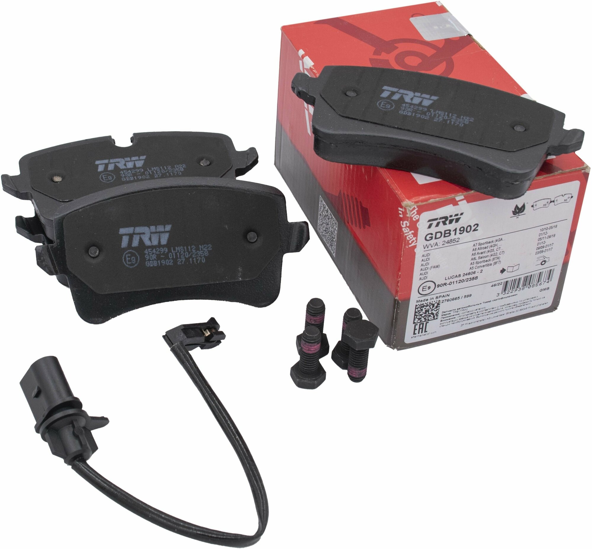 Type: disc brake pads, car brand: Audi, Porsche, car model: Audi A4, Audi A5, Audi A6, Audi A7, Audi Q5, Audi S5, Audi S6, Citroen C4, Maybach 57, Porsche Macan, purpose: rear, set: 4, features: wear sensors included, product is gray