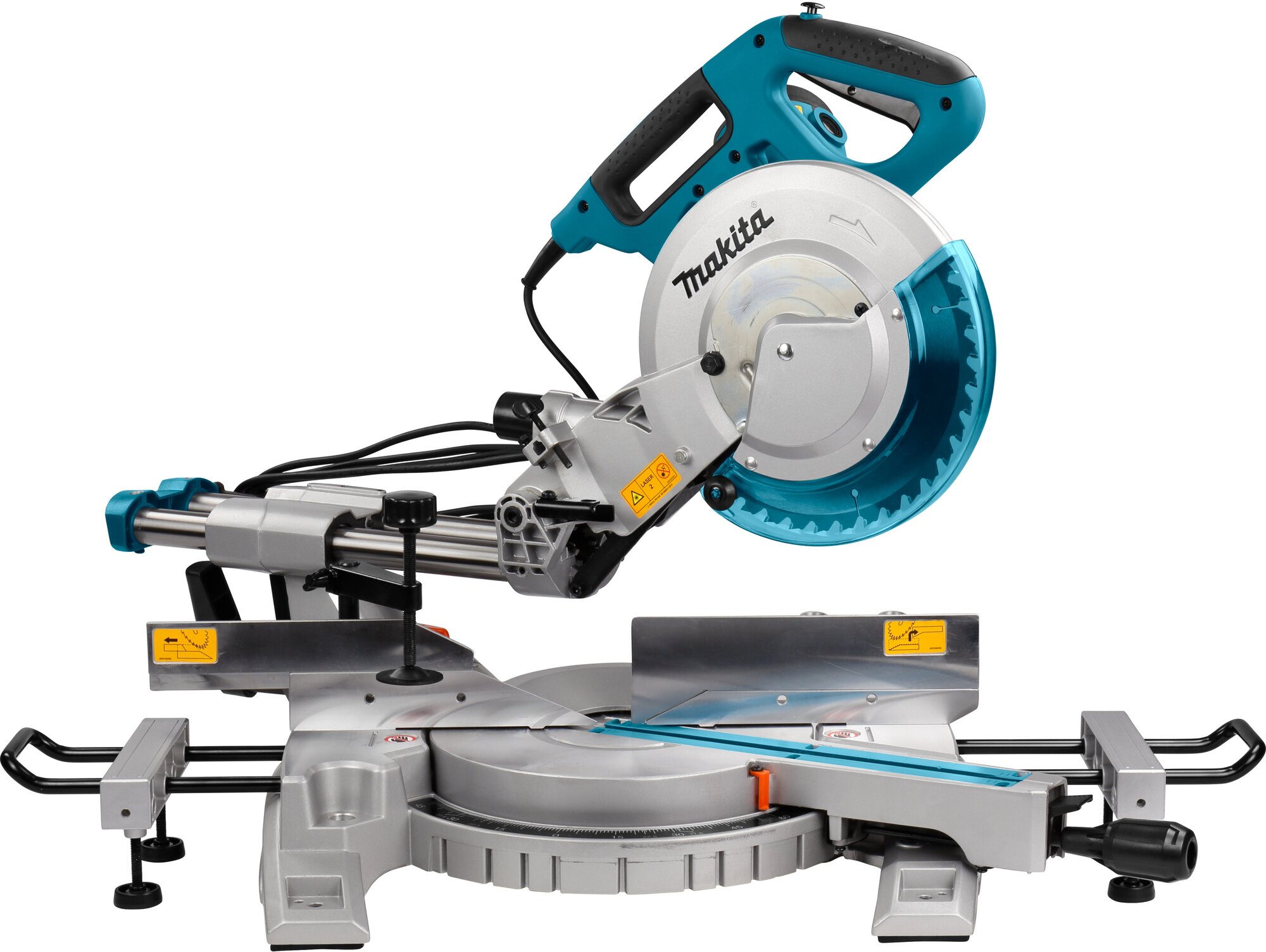 Miter saw, saw blade, clamp, socket wrench, adjusting triangle, dust collector, support extensions, box