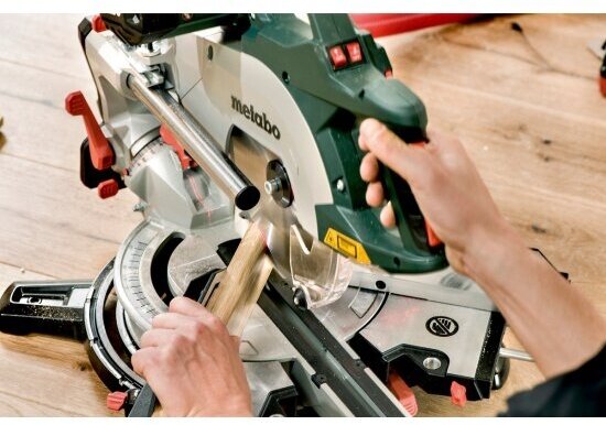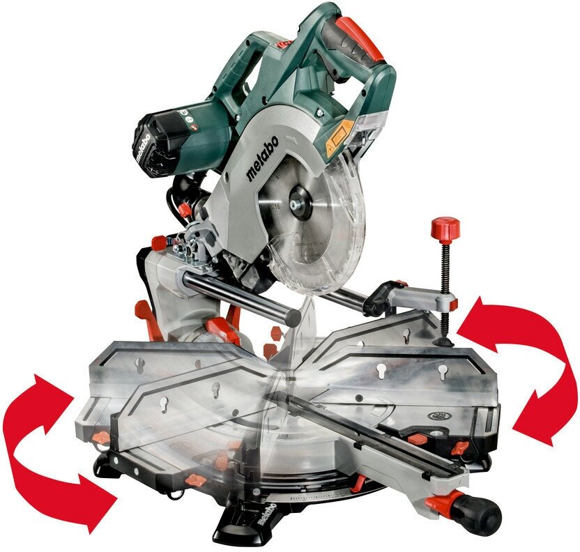 Saw blade, 2 built-in table extensions, material clamp, saw blade change tool, cable winding holders