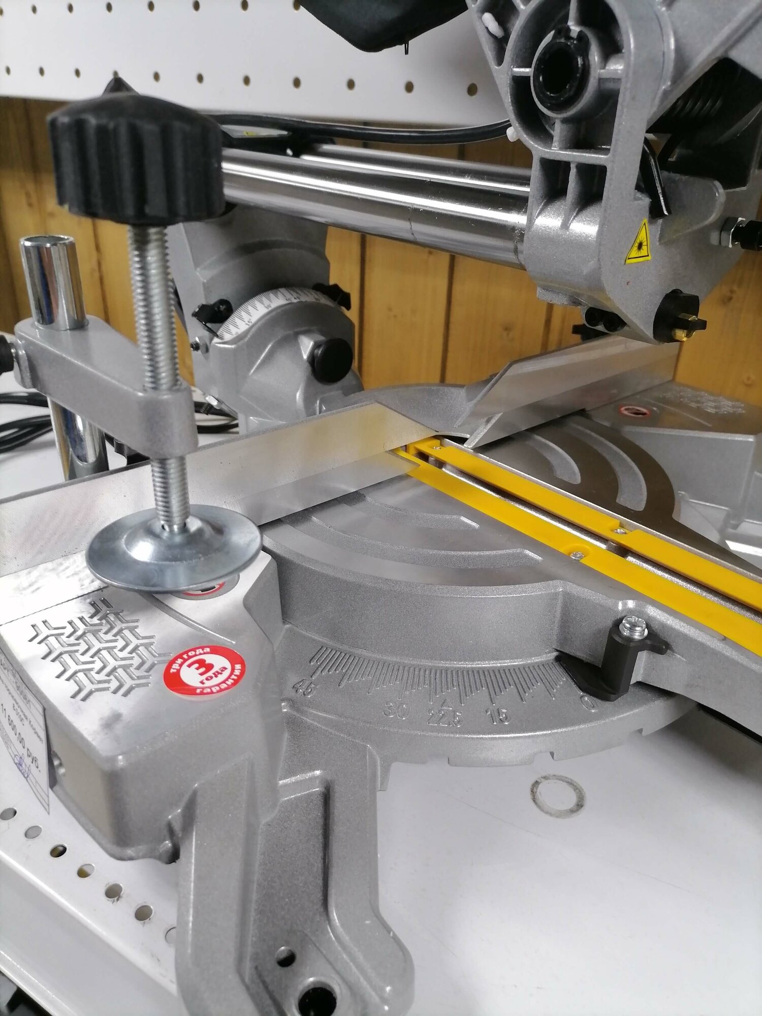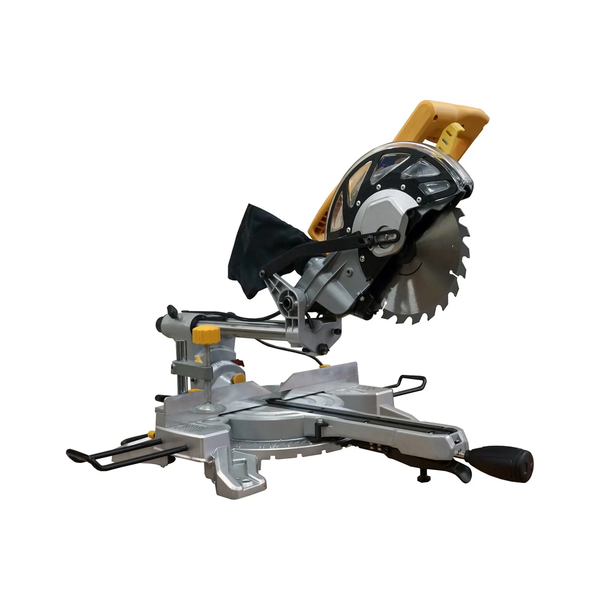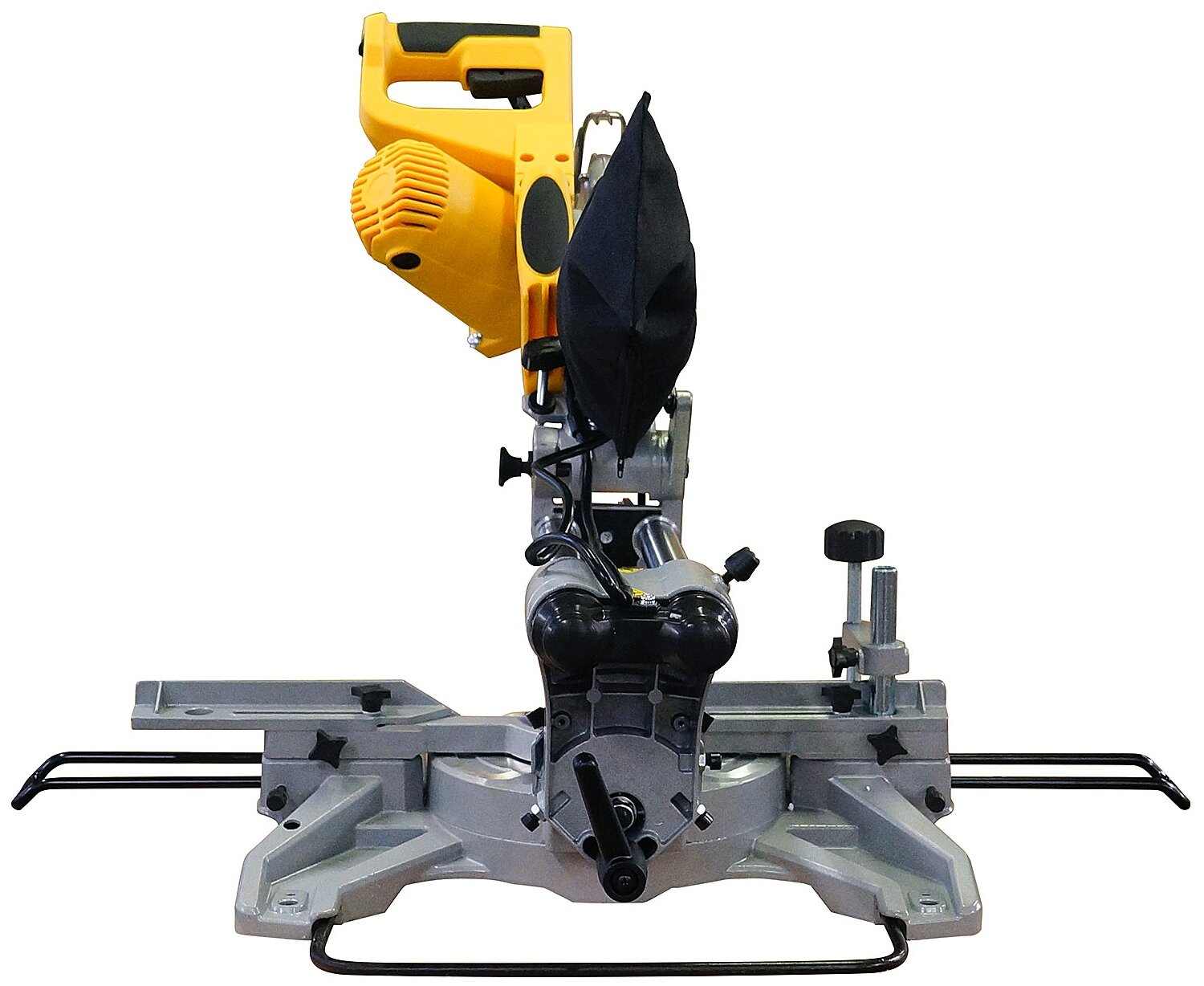Miter saw - 1 pc., table extension - 2 pcs., clamp - 1 pc., dust bag - 1 pc., handle - 1 pc., hex key - 1 pc., carbon brush - 2 pcs., instruction