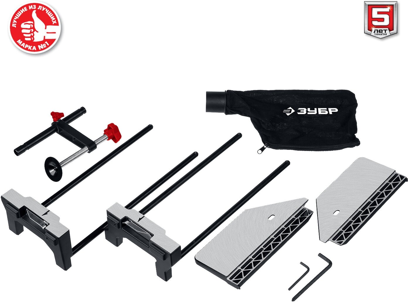 Miter saw, wrench, clamp, dust bag, table extensions, instruction manual
