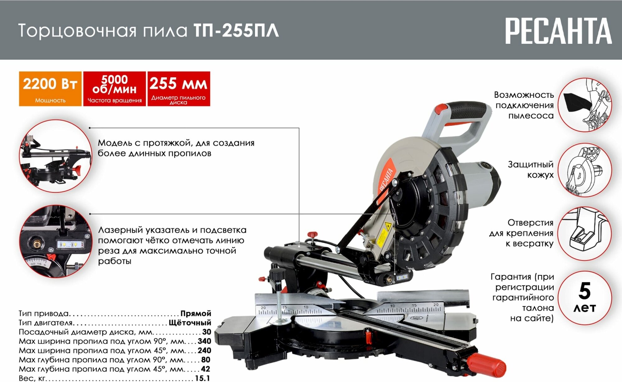 Description: Type: miter saw, laser marker, disc diameter: 216 mm, Power W: 1500, cutting depth 90°: 65 mm, cutting width 90°: 305 mm, with pull, power supply: from the mains, design features: the ability to connect a vacuum cleaner, laser �
