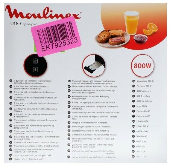 Number of toasts: 2, number of compartments: 2, set: crumb tray, body material: plastic, control type: mechanical, additional modes: heating function, defrost function, power: 800 W, high