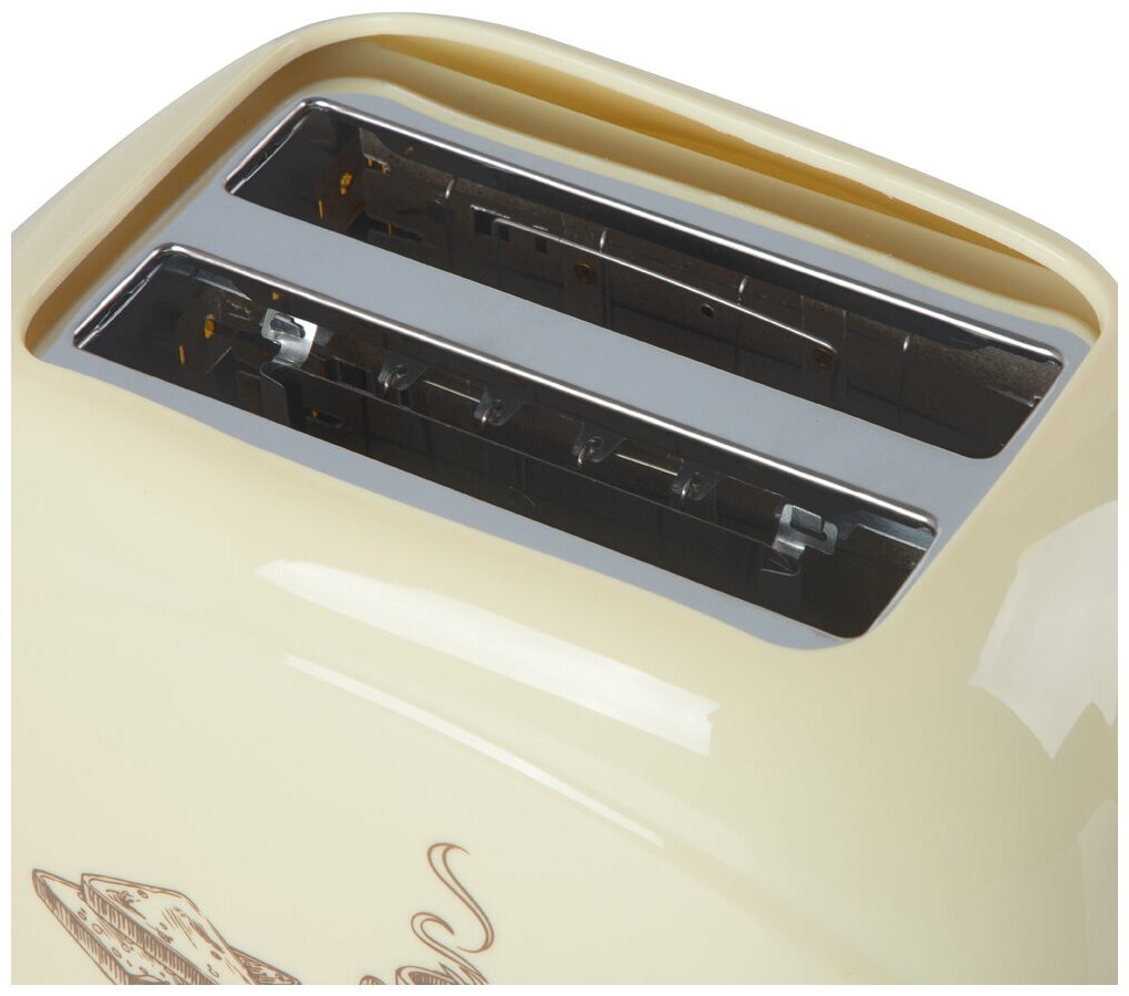 Number of toasts: 2, number of compartments: 2, set includes: crumb tray, body material: plastic, control type: mechanical, power: 850 W, features: cord compartment, thermally insulated body, additional