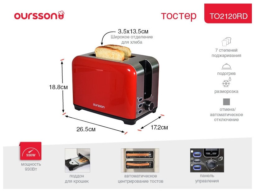 Number of toasts: 2, number of compartments: 2, set includes: crumb tray, body material: plastic, control type: mechanical, additional modes: heating function, defrost function, power: 930 W, wide