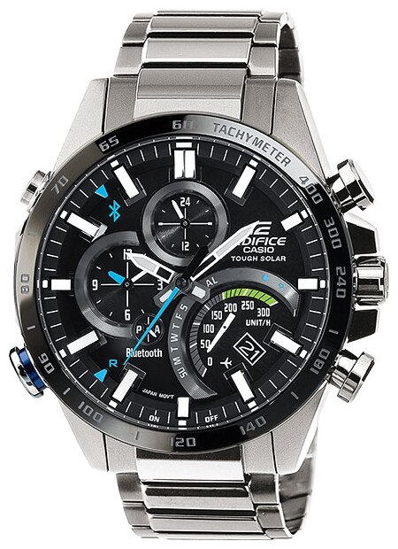 Stopwatch, countdown timer, tachymeter, chronograph, alarm clock, second time zone, battery indicator, world clock